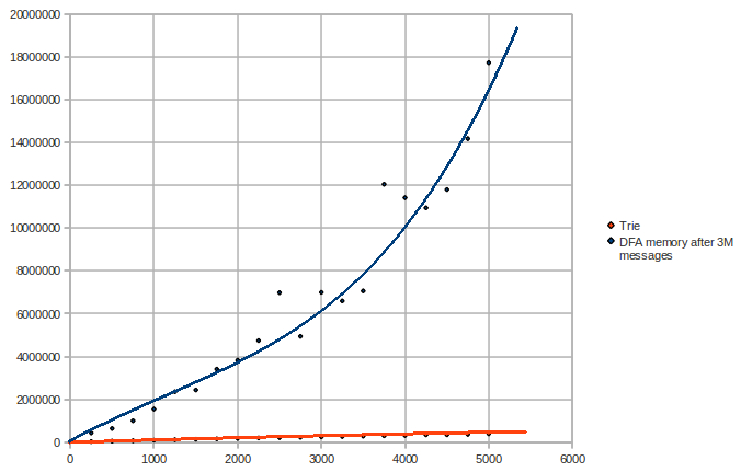 Let us have a closer look at the complexities of the trie and the DFA. Maybe we get a clue of what's wrong with the DFA. Here is a graph of the tests if varying the number of patterns (3M messages, number of patterns vs time in microseconds):