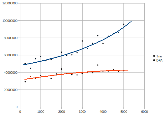 Surprise! The DFA has a rather exponential/quadratic complexity, while the trie keeps pretty linear or rather logarithmic.