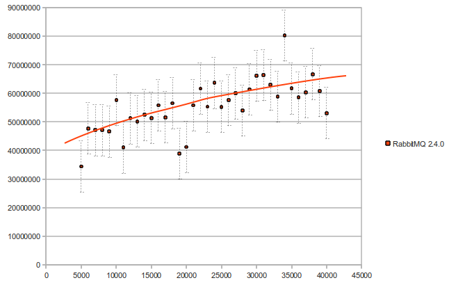 We implemented the trie approach in the new RabbitMQ version 2.4.0. Here is what we got, when we tested Rabbit itself, with the new implementation (number of bindings vs time in microseconds):